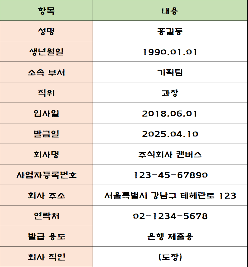 재직증명서는 말 그대로, 내가 현재 어느 회사에 재직 중이라는 걸 공식적으로 증명해주는 문서입니다. 대부분 아래 항목들이 포함됩니다:
